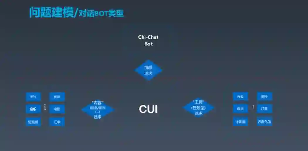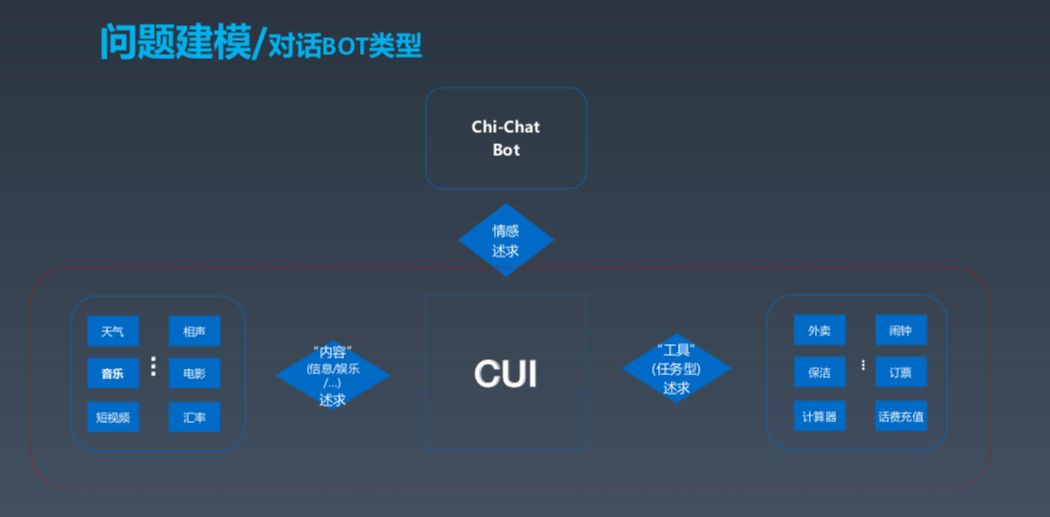 在讲问题建模之前,我们先划分一下所谓的对话类型。按需求来分,分为这几部分,第一部分是通过对话获取内容,比如天气、音乐、汇率等信息和内容,类似于搜索;还有一种偏向工具型,如点外卖、定闹钟等;另外还有一种重要的对话类型,即情感诉求。