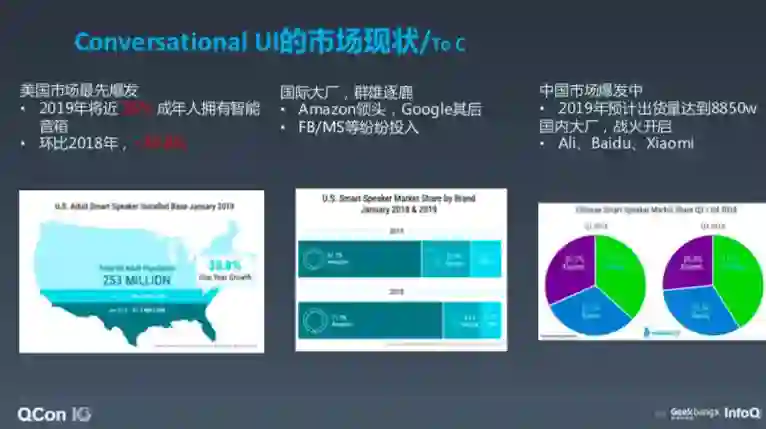 数据显示,很多人都用上了智能音箱,现在美国智能音箱市场是最具爆发力的,据预测,2019 年,25% 的成年人家里都会拥有至少一台智能音箱,相较 2018 年同比增长 39%。当然,智能音箱市场玩家众多,包括大家熟知的亚马逊 Echo,它点燃了市场的一把火,紧随其后的是 Google。据预测,国内市场智能音箱的出货量将达到 8000 多万,战火从去年开始烧起来,今年烧得最激烈,百度不算非常成功,但还在追赶,类似于谷歌的角色。现在份额第一的是阿里的天猫。