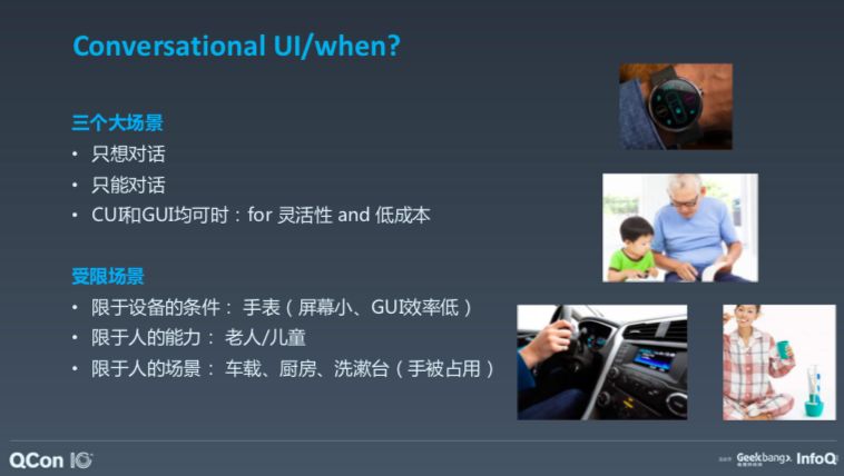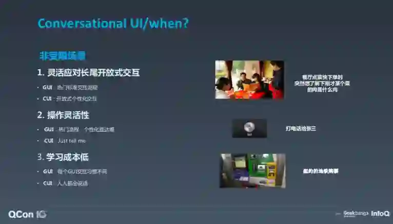 有人可能会问,一定要用语音吗?什么时候语音对话交互会非常有效呢?其实有三个场景,一是你只想对话或只能对话;第二种是既可以对话,也可以使用 GUI,但对话的方式更加灵活、成本低时。只能对话是受限场景,受限场景还有很多,比如手表屏幕太小,对话显然更方便,UI 的交互效率很低。还有一种限制于人的场景,比如车载、厨房、洗漱台等手被占用的场景,另外就是非受限的场景。那么,语音对话式交互如何比其他交互更好?可以更灵活地应对长尾开放式交互,让操作更灵活,交互成本更低?