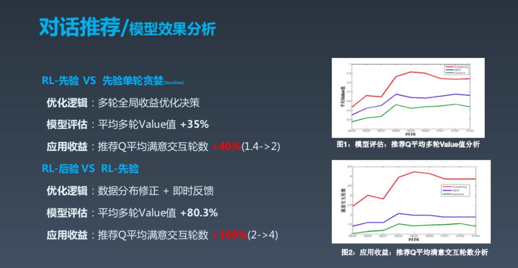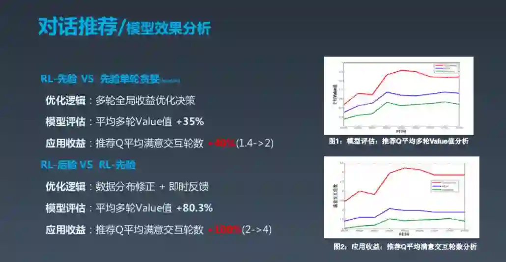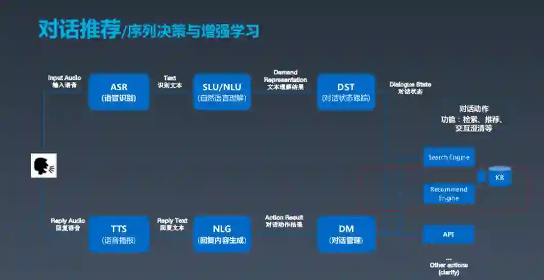 实际上,对话系统不仅限于自然语言理解,还涉及一些其他技术,比如在对话中进行推荐。推荐的核心定位是要能够激发用户持续的对话,这基本上与其他系统的推荐目标一致。这其中的一些推荐场景与搜索 query 类似,但和其差别在于希望获得整个对话全局过程中的满意度。