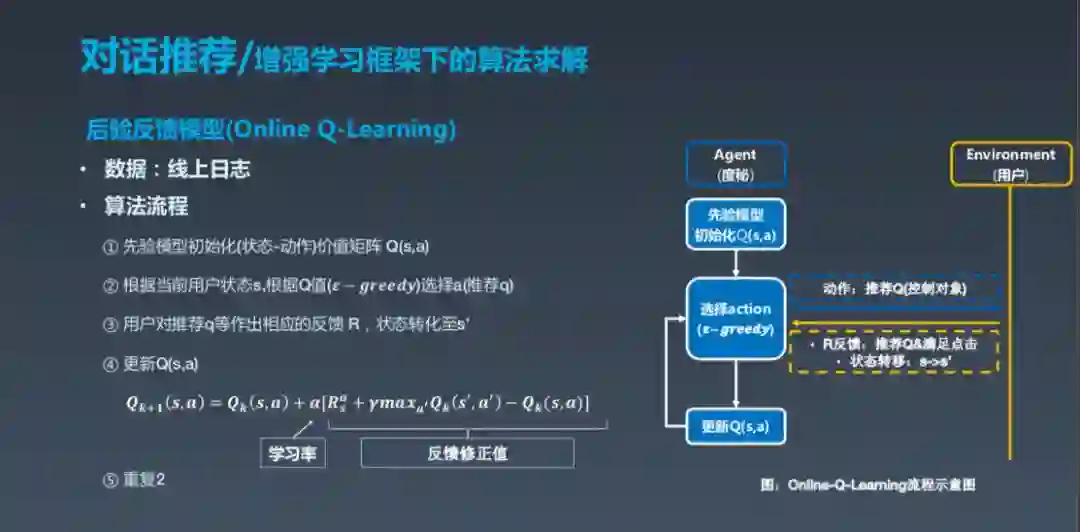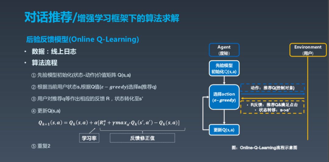 然后是后验反馈模型,是指先验模型初始化后,用 epsilon greedy选择 Action,epsilon greedy 可以理解成有一定概率的贪心,选择之后更新 Q,得出相应的学习率等。