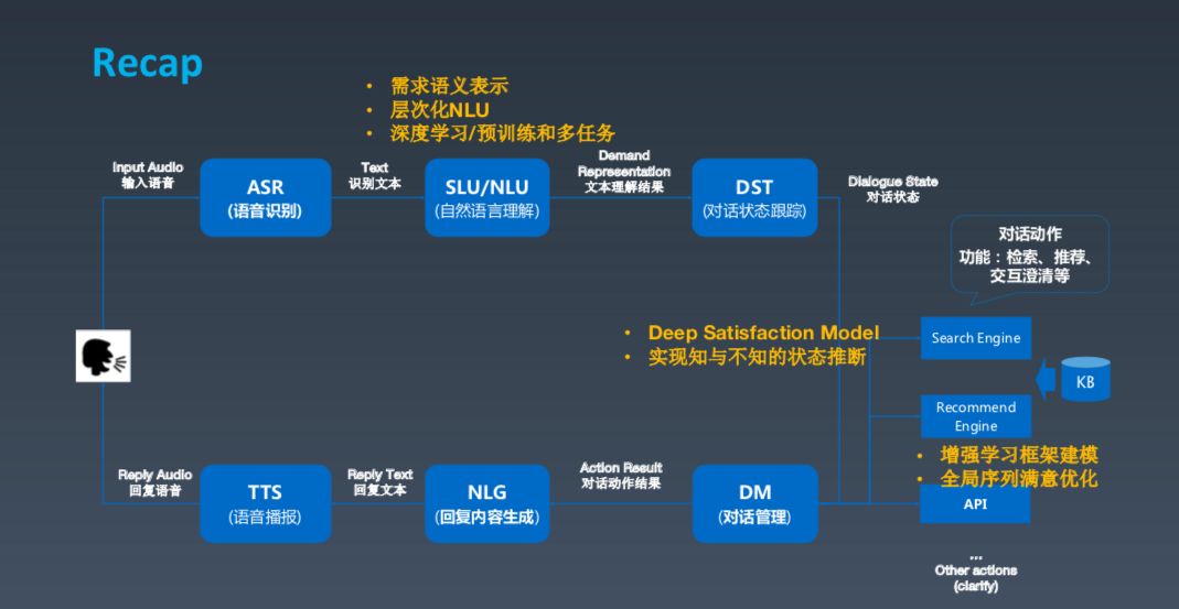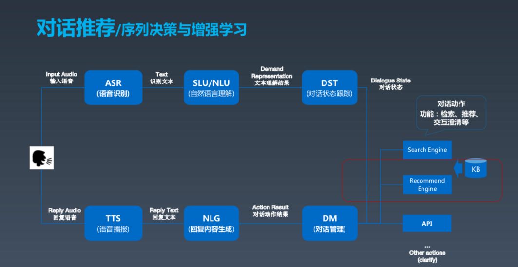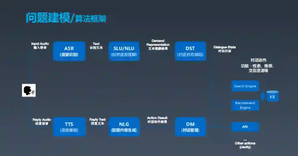 这是一张经典的对话式框架建模图,基本上分为几大块,第一块是用户,如果用户发出语音,我们需要先做(ASR)语音识别,包括之前的唤醒。ASR 之后产生文本,再之后进行对话理解,了解用户相应的需求。这两个部分实际上是做对话的跟踪状态跟踪和对话管理,可以理解成根据上下文确定并采取一些动作以满足用户需求。这些动作包括搜索、推荐等。最后,Bot 组织成一段人话,生成语言,用 TTS 的方式输出。这就是对话式 Bot 的基本框架。
