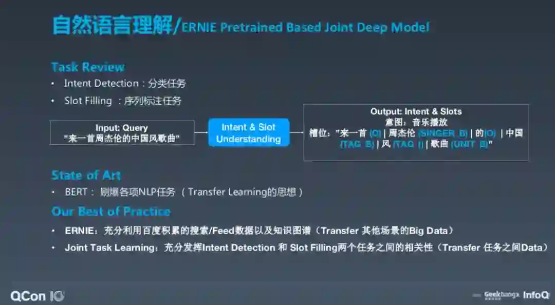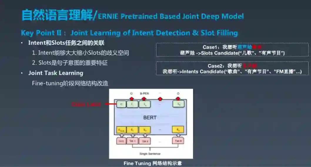 BERT 很厉害,刷爆了各项 NLP 任务,我们的很多工作都基于此。BERT 的一个核心思想是迁移学习,我们对此做了两方面的改进,可以说是将迁移学习思想进一步推进,第一是对 EARNIE,用自己的数据做了训练和改进,核心的一点是要迁移其他产品的数据,同时迁移知识的数据;第二点是联合任务学习,当然这也不是新鲜事,但重要的是要结合 Intent Detection 和 Slot Filling 两个任务之间的关系和数据。