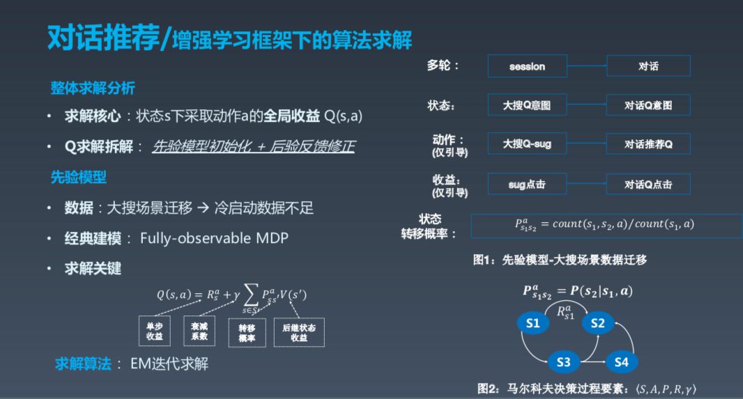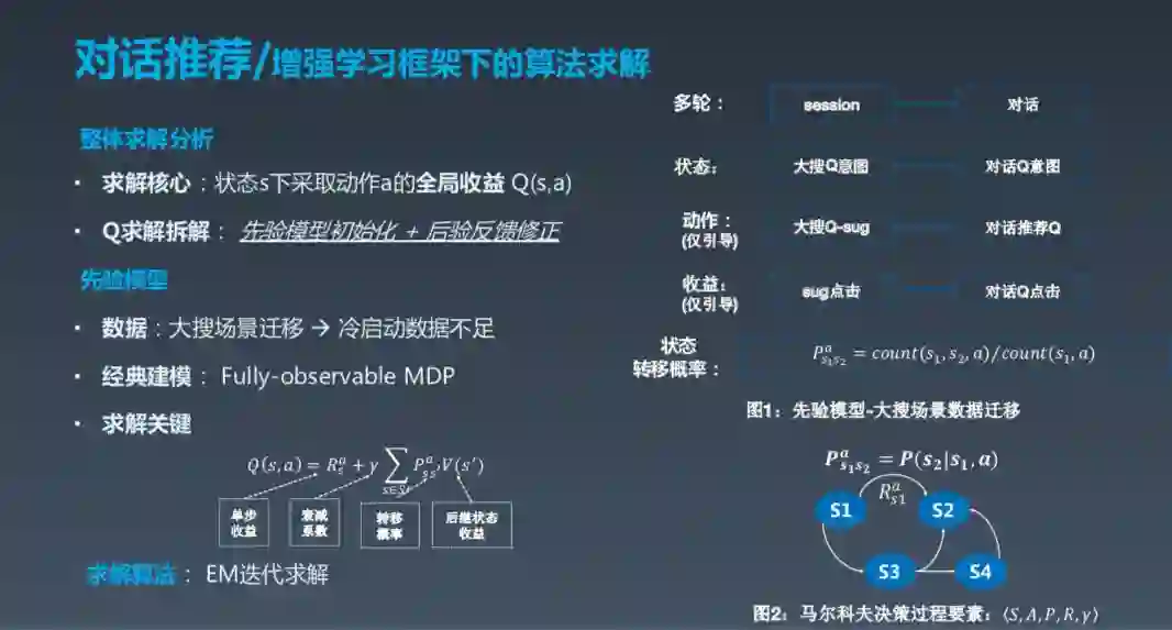 增强学习框架下的算法求解核心在于在状态 s 下采取动作 a 的全局收益,这里的 State 可以理解成各种信息的融合,包括用户信息、历史信息等,完全的 MDP 是指这一轮状态只跟上一轮相关。动作可以建模成几类,一种是满足曾经,另一种是推荐。Reward 这部分实际上是最有技巧,也最难做的一部分,因为到底怎样做 Value 很难。我们希望找到一个策略,能够让所有的 Action 路径加起来 Reward 最大,所以这是一个程序的序列问题。其实求解分析很容易,比如说如何在 X 的状态下,采取一个 Action 让全局的收益最大。