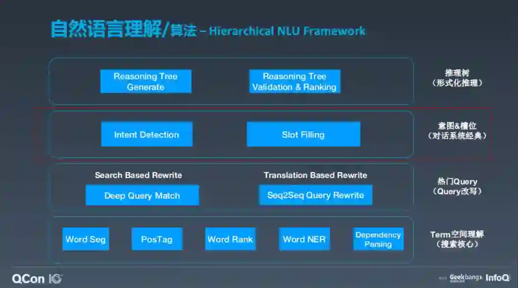 对此,我们有 Hierarchical NLU Framework 把热门 Quarry 变成一个搜索,通过 deep match 也可以把它变成翻译问题。