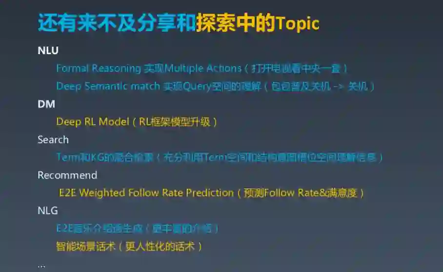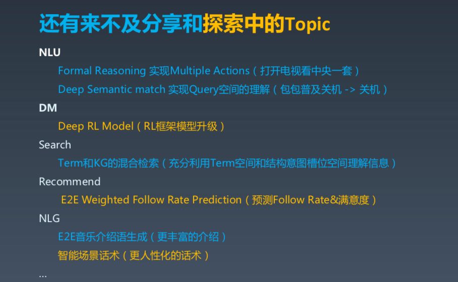 我们正在进行的探索包 NLU 中的形式推理进行 Multi-action,深度增强学习,以及 Term 和 KG 的混合探索,NLG 中的智能场景话术等。