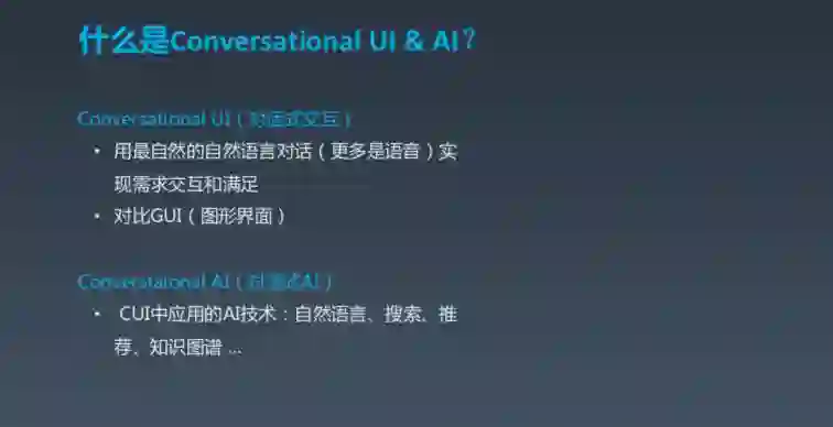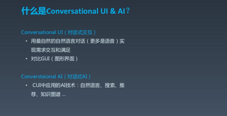 在介绍对话式 AI 之前,我们有必要先了解一下 Conversational UI(对话式 UI)的概念。很简单,就像我们今天的分享一样,我们用对话来实现自然交互,这其中所用到的技术就是对话式 AI。我不用对话系统来定义,原因在于,要实现自然交互要用到很多技术,可能不仅限于大家传统理解上的自然语言技术,还包括搜索、推荐、知识图谱等,所以说,对话式 AI 基本上是一个 AI 的集大成者。