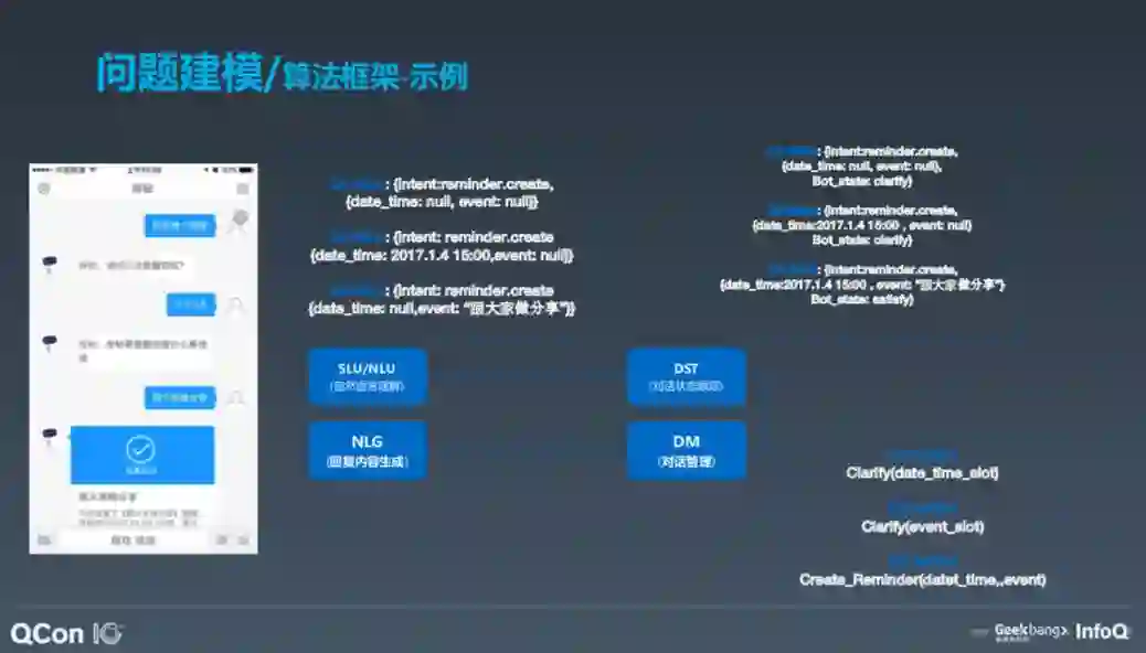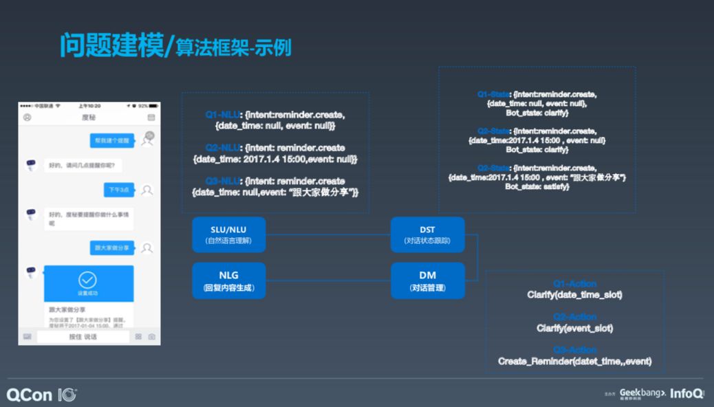 首先是进行 NLU,即自然语言理解,了解任务目的是设置一个提醒。接着是对话状态跟踪,即要达到什么样的状态;对话管理,即理解任务是否可以创建,比如定时几点提醒用户。接着进入第二轮,如果用户要求定下午三点的闹铃,那么把两轮信息连接到一起,创建三点钟提醒用户这一问题。这是创建提醒任务的整个框架。