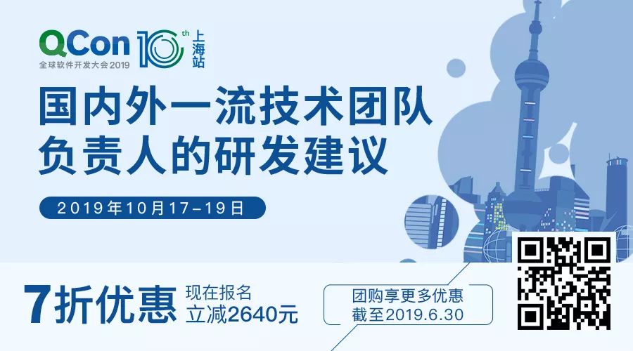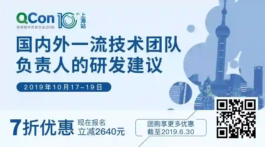 QCon 全球软件开发大会(北京站)2019 已经圆满结束,QCon 上海 2019 即将起航,点击 「 阅读原文 」了解详情。大会 7 折早鸟票限时开售,现在报名立减 2640 元,团购可享更多优惠!有任何问题欢迎联系票务小姐姐 Ring ,电话:13269076283 微信:qcon-0410