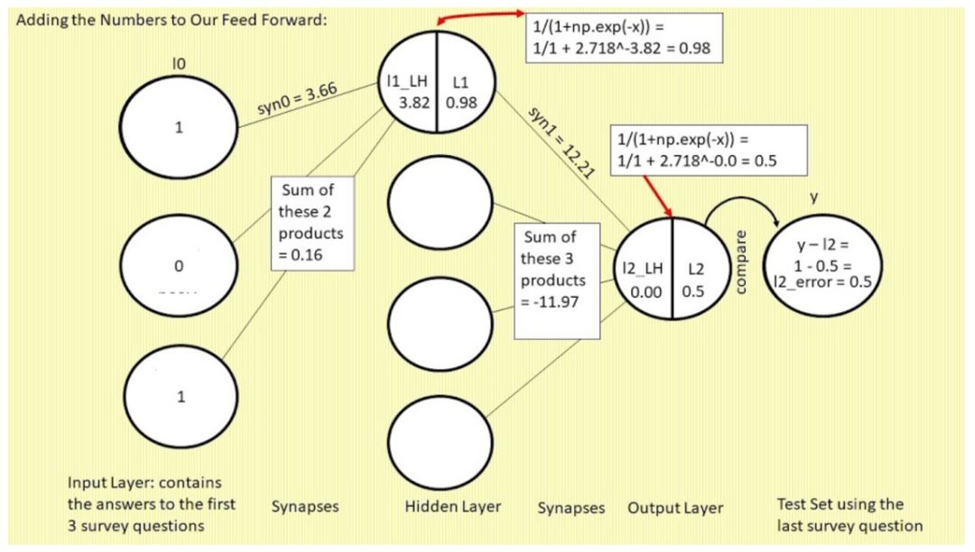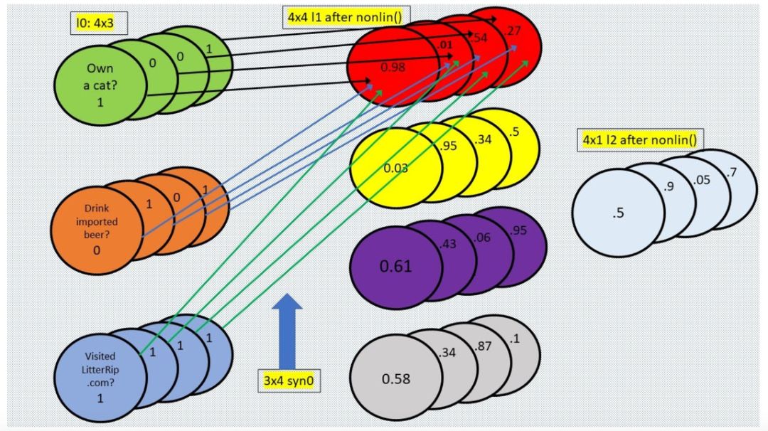 l0= 1syn0,1= 3.66l1_LH= 3.82l1= 0.98syn1,1= 12.21l2_LH= 0.00l2= 0.50y= 1 (This is a "Yes" answer to survey question 4, "Ever bought Litter Rip?" which corresponds to training example l2_error = y-l2 = 1-0.5 = 0.5