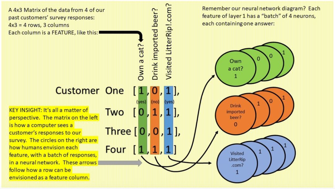 首先,你需要将之前顾客的调查数据和他们对前三个问题的回答输入到网络中,进行训练。该网络使用这些数据预测某位顾客是否确实购买了新款猫砂。然后网络再将预测结果与顾客第四个问题的答案进行对比。第四个问题的答案就是标签,作为事实供网络进行对比。例如,如果网络预测结果是“是的,我认为这位顾客买过 Litter Rip! 猫砂”,而这位顾客第四个问题的答案确实是“Yes”,那么你就拥有了一个成功的神经网络。