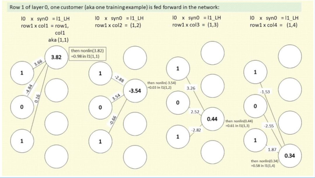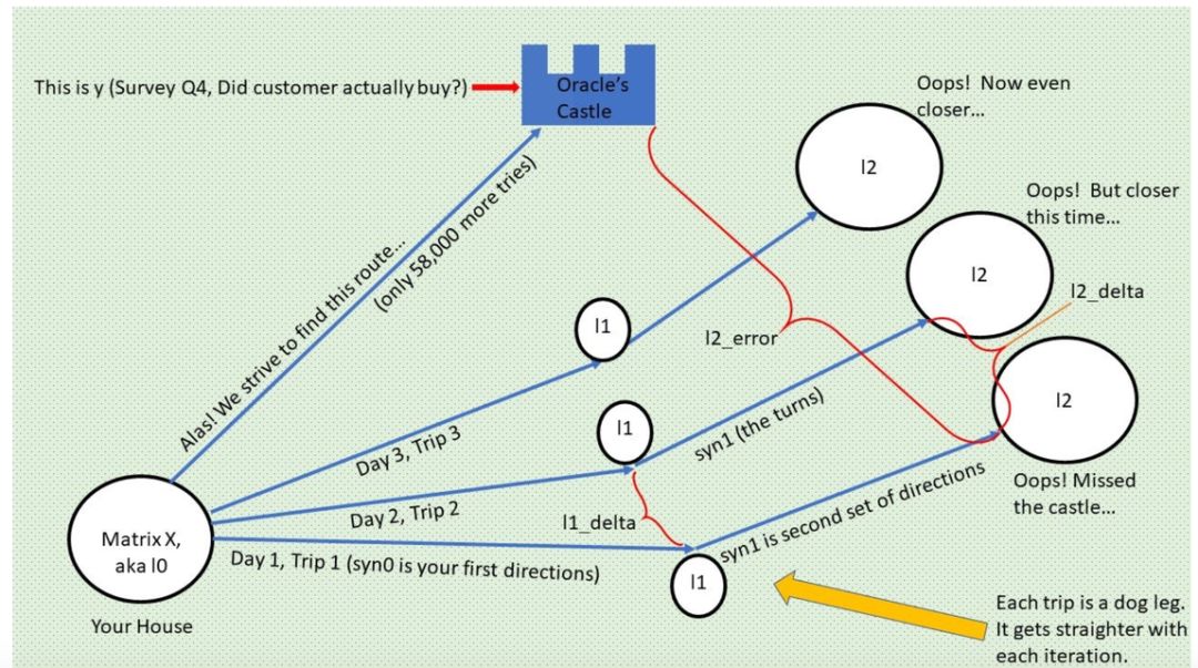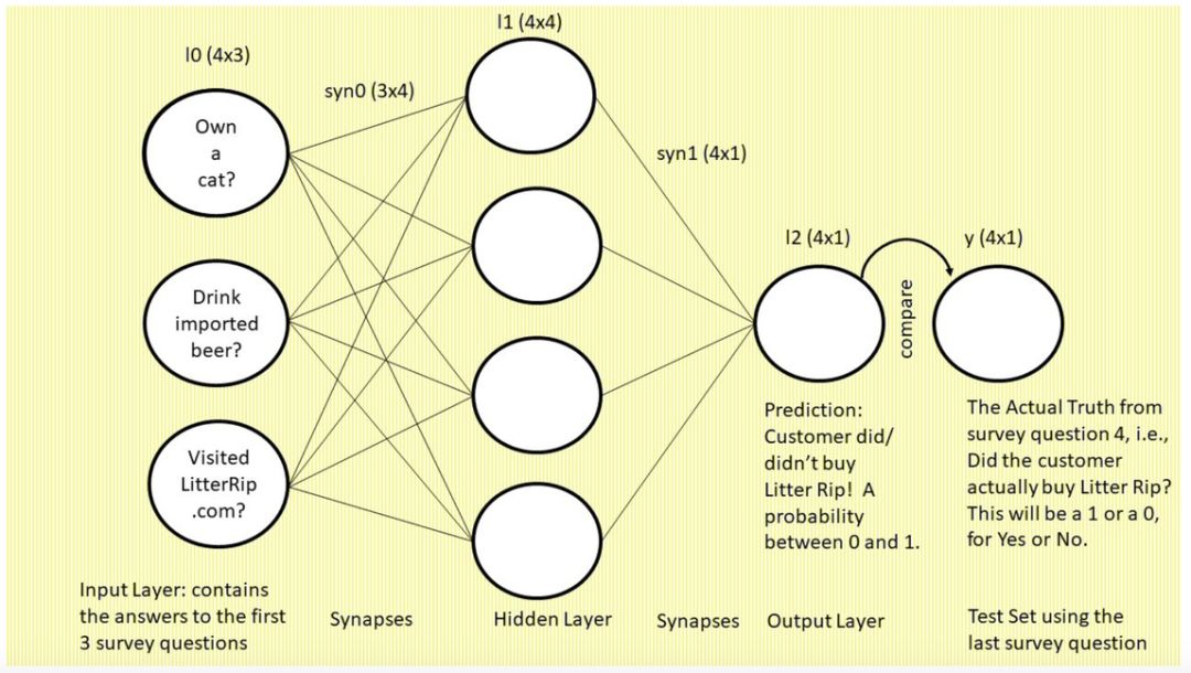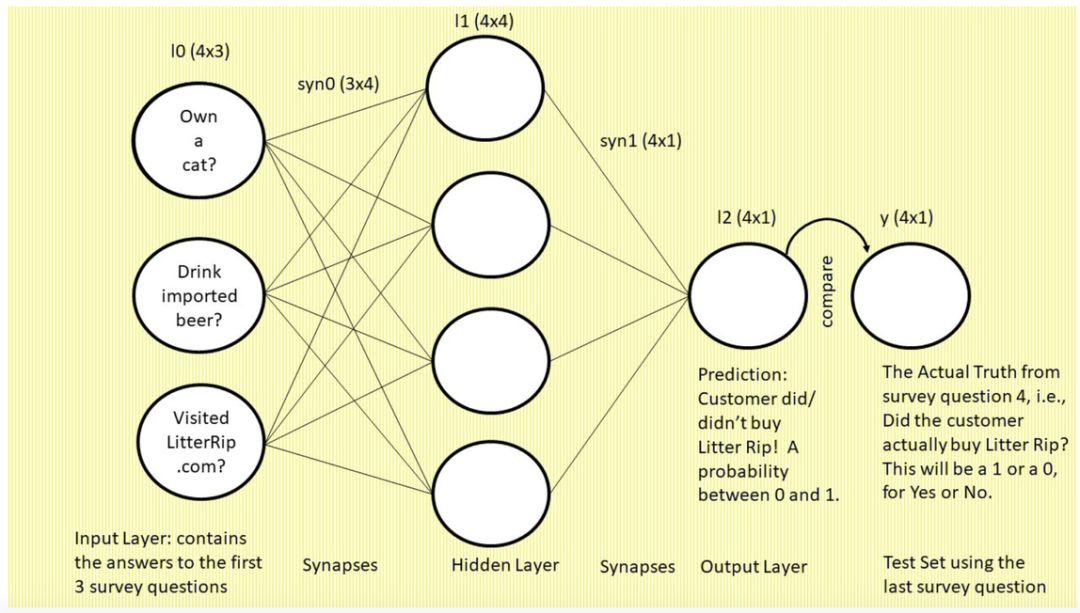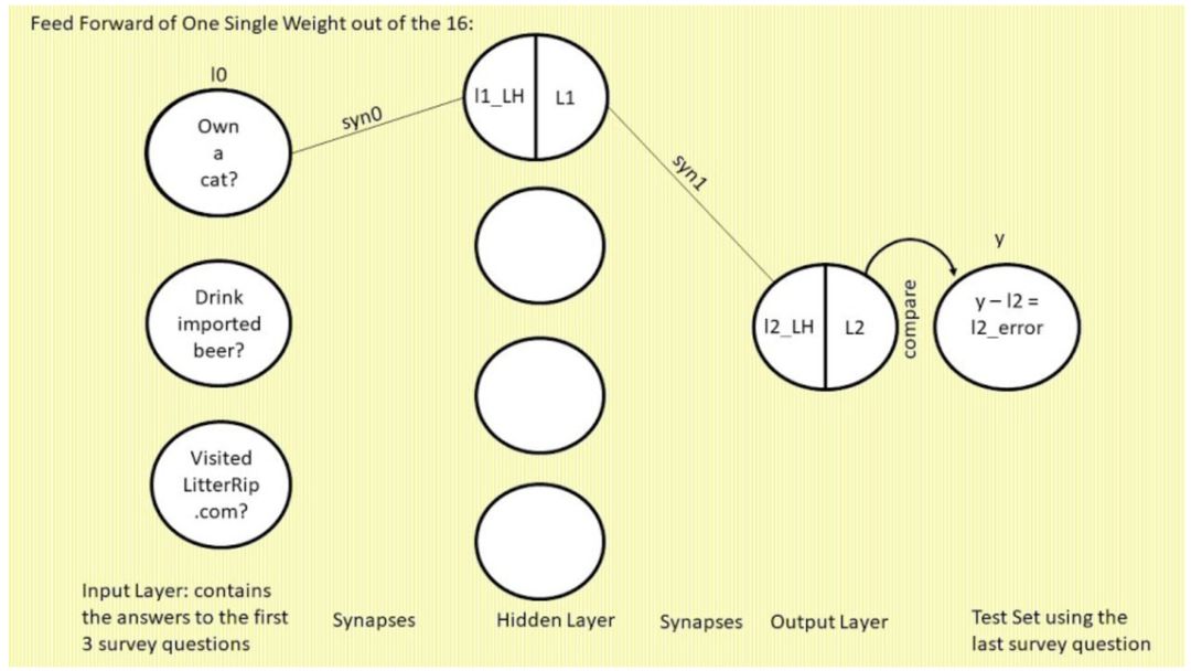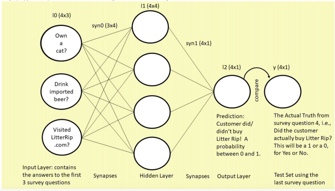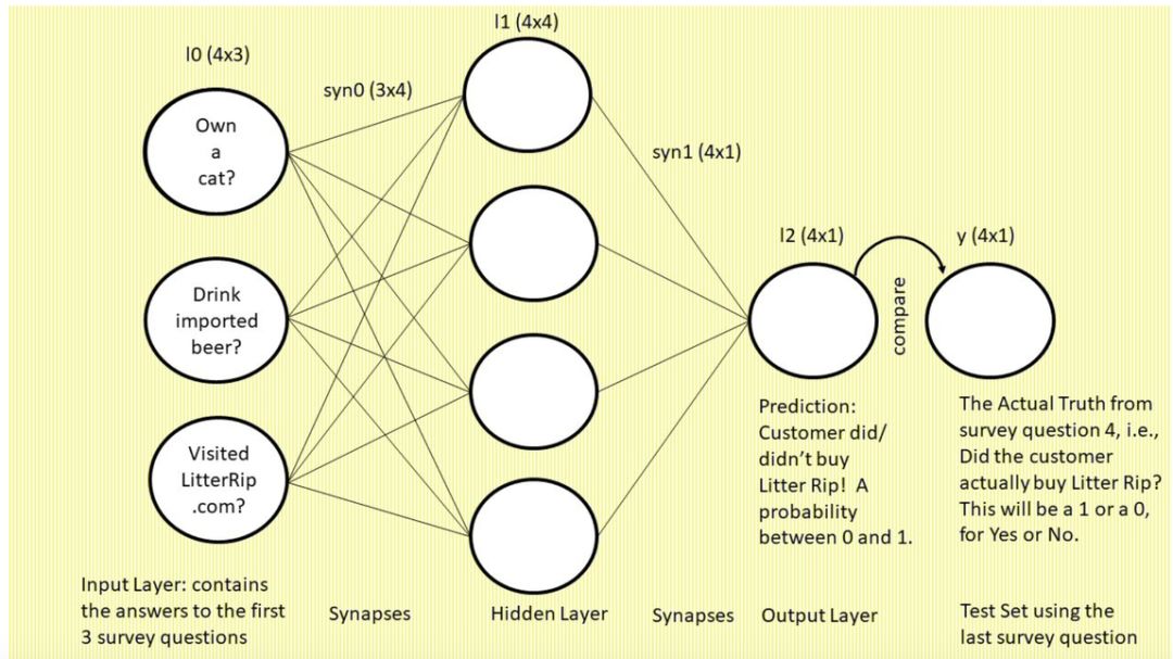 最右侧标注“y”的单个圆圈表示真值,即每个顾客对第四个调查问题“你是否购买过 Litter Rip! 猫砂?”的回答。这个圆圈有两个选择:0 表示没买过,1 表示买过。神经网络将输出一个预测概率,并将其与 y 进行对比,查看准确率,然后在下一次迭代中吸取教训。神经网络在数秒时间内可以完成数万次试错。