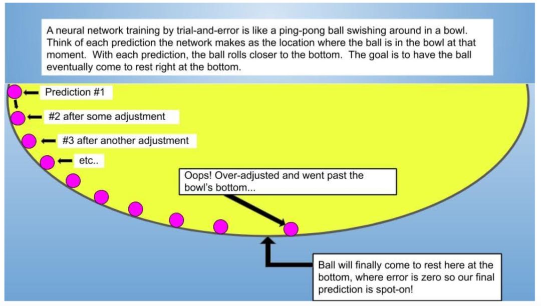 网络每次进行更好的预测时,粉色的预测球沿着碗侧向底部全局最小误差值前进。每一次预测后,网络将预测结果与第四个问题的答案进行对比,这类似于在特定时刻衡量预测球与碗底的距离。衡量预测结果与真值的距离叫做“找出误差”。网络每次预测的目标都是持续地缩短与全局最小值之间的误差。