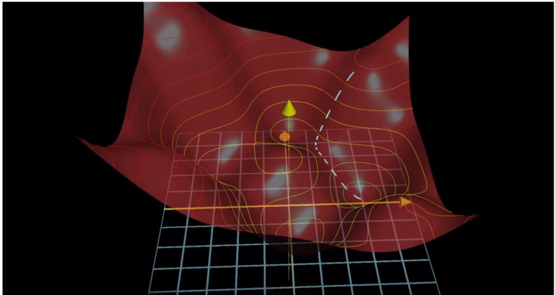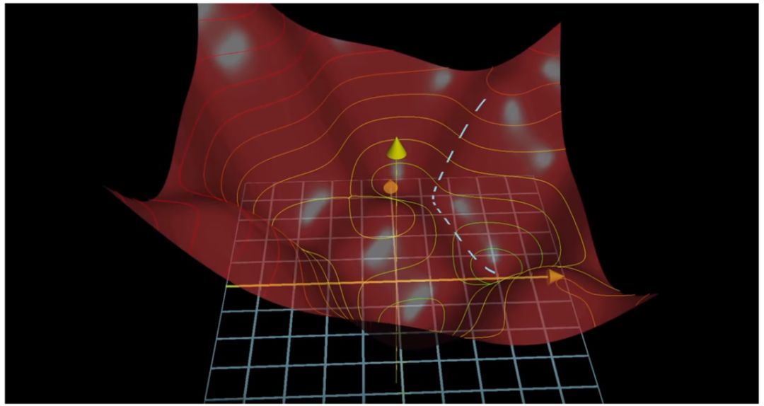 总之,红色碗表面上每一个红点表示网络使用特定问题组合和权重组合进行的一次试验。每一个凹陷表示“这一步走在了正确的道路上”,网络注意到这一点并将继续保持。每一个凸起处表示“这一步走错了方向”,网络也会注意到并摒弃它。预测球的路径(白色虚线)歪歪扭扭,是因为预测球在通往碗底的路上不断寻找凹陷处、避免凸起处。你可以说白色虚线是预测球通往碗底的最高效路径。