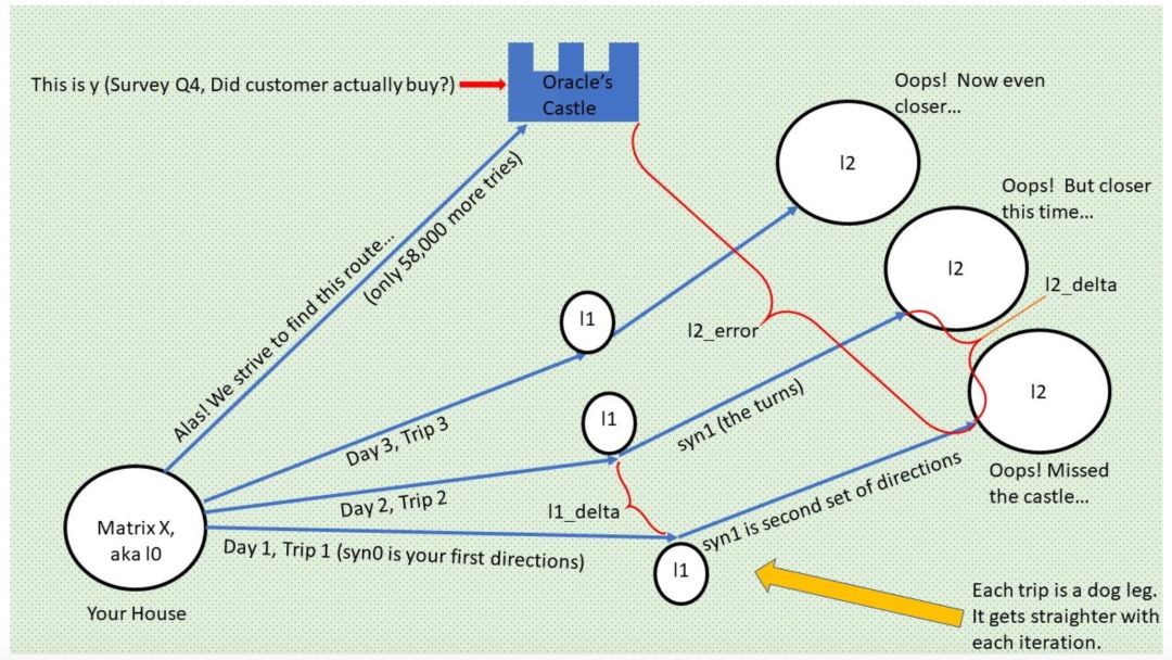 在详细解释这些概念之前,我想把“碗和球”的类比再推进一步。上图展示了神经网络训练过程中的四个主要步骤,但过于简化。它准确地表示了只有一个调查问题的网络,该网络也仅基于这一个问题做出预测。