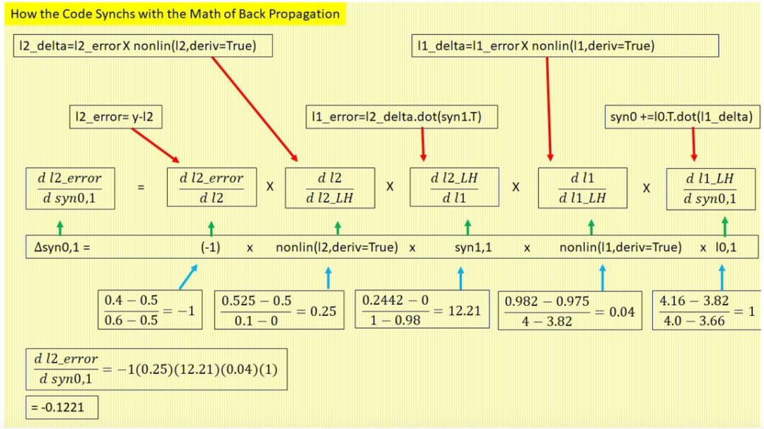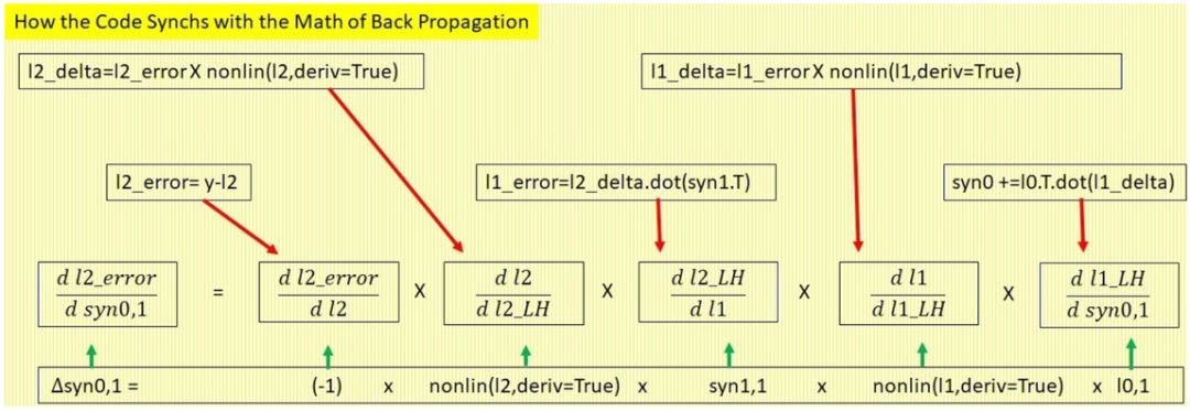 数学就是在做这样的事情:如果你把 l2_delta(期望的完美结局)乘以 syn1(导致错误结局的情节),那么你将收获 l1_error。改变造成错误结局的情节,下一版剧本将变得更好。