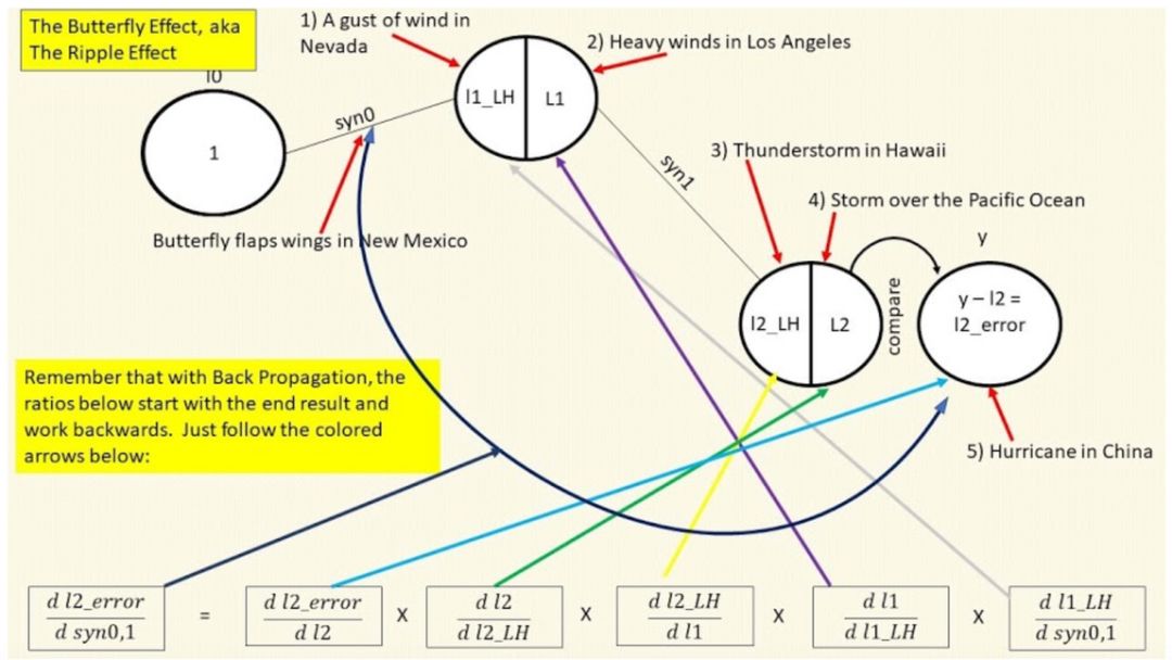 倒过来看,我们可以说“飓风 l2_error 的变化取决于 l2 的变化,l2 的变化取决于 l2_LH 的变化,l2_LH 的变化取决于 l1 的变化,l1 的变化取决于 l1_LH 的变化,而 l1_LH 的变化取决于蝴蝶 syn0,1 的变化”。该示例中所用的规则即步长等于坡度。
