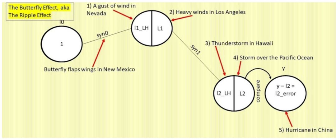 Ripple 1,即对 syn0,1 进行调整后的第一个连锁反应,将导致 l1_LH 上升一定比率,这个比率就是变化率。这就是“内华达州的大风”(见下图灰色箭头)。