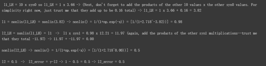 知道了 l1_error,你就可以计算在下次迭代中将 l1 改变多少才能得到更好的 l2 预测,而这就是 l1_delta。