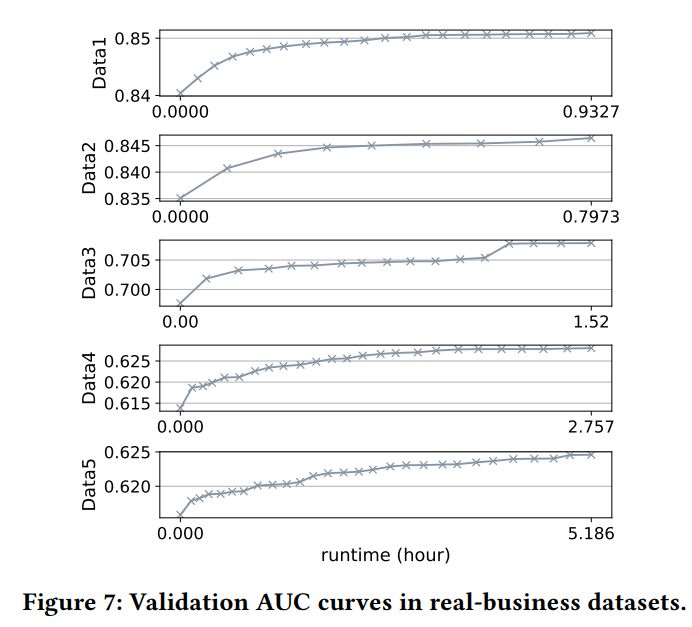 推断延迟:见表 7。从中可以得出:AC+LR 的推断速度比 AC+W&D、Deep、xDeepFM 快几个数量级。这说明 AutoCross 不仅可以提高模型表现,同时保证了很低的推断延迟。