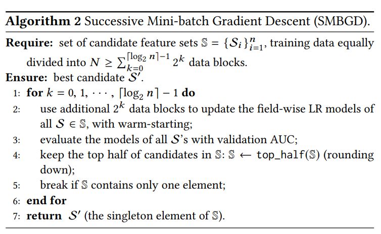 算法 1 中的一个关键步骤是评估候选特征集。最直接的方法是用每个候选特征集训练模型并评估其性能,但是这种方法计算代价巨大,难以在搜索过程中反复执行。为了提高特征集评估的效率,AutoCross 提出了逐域对数几率回归(field-wise logistic regression)和连续批训练梯度下降(successive mini-batch gradient descent)方法。