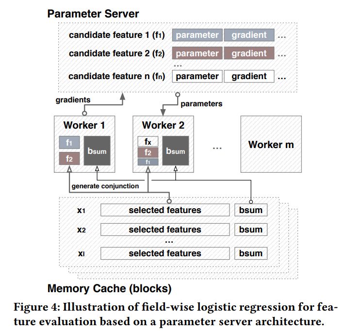 图 4 说明了如何将逐域对数几率回归部署在参数服务器架构上。逐域对数几率回归与参数服务器的结合可以提高特征集评估的存储效率、传输效率和计算效率。在逐域对数几率回归训练结束后,AutoCross 计算训练得模型的指标,并以此方法来评估每一个候选特征集。