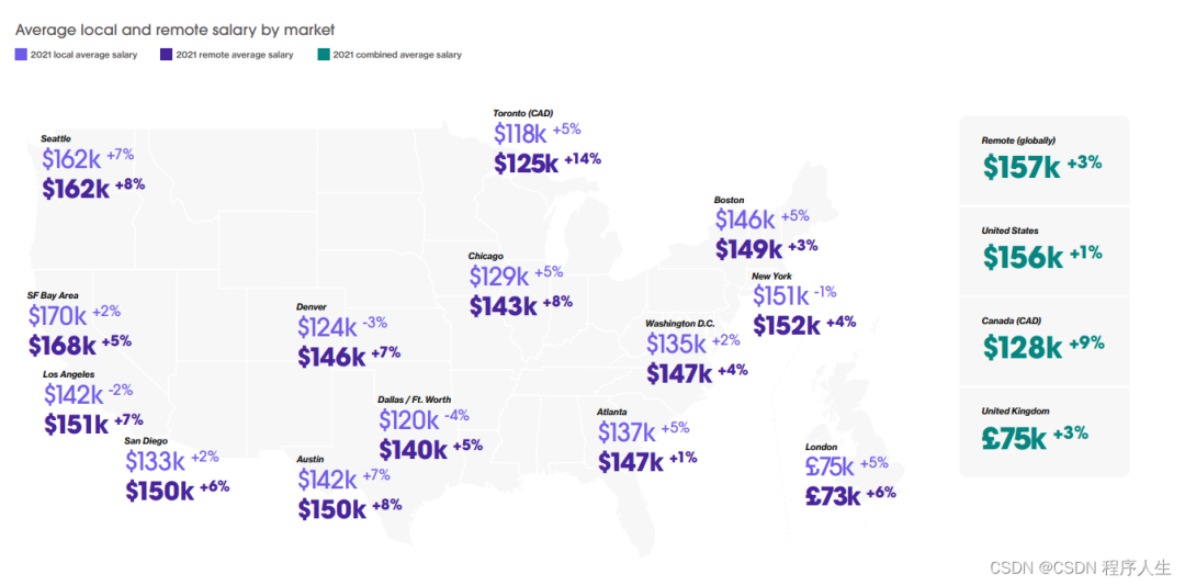 招聘全球化,所有市场的远程工资都在增加,随着软件工程师有更多机会为全球的公司工作,加拿大和英国正在追赶美国,提供更具竞争力的薪酬。在城市层面,与大型科技中心相比,较小地区也有较高的薪酬增长。