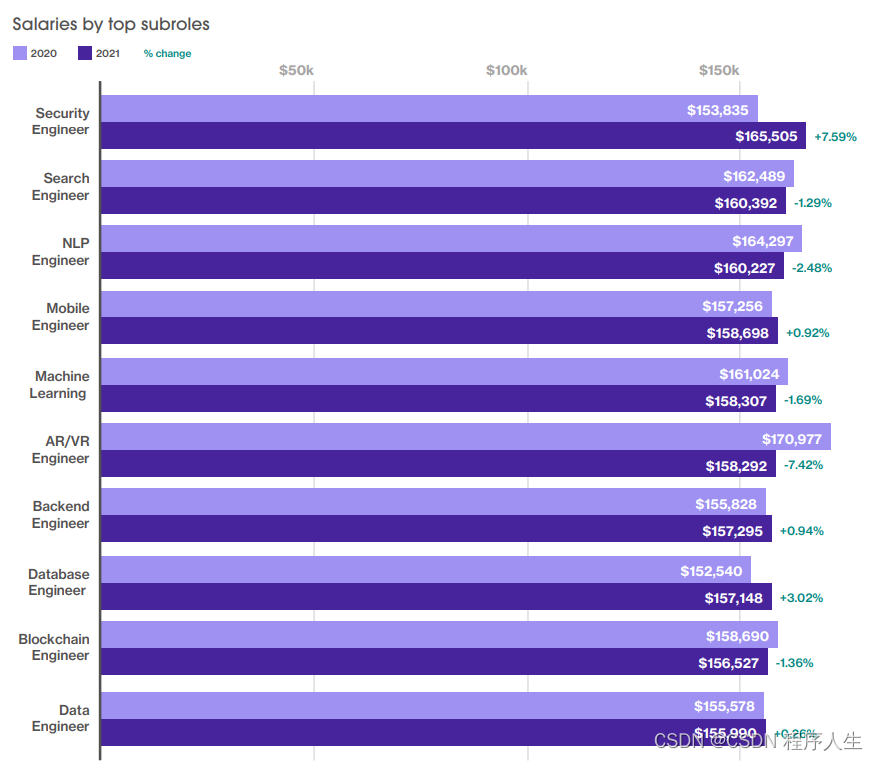 与2020年相比,2021年安全工程师的平均年薪达到了16.5万美元,增长了7.6%。语音、聊天机器人和人工智能驱动的转录也一直是科技界的热门领域,所以NLP工程师的薪资也很高,平均年薪16万美元。随着各行业公司对元宇宙的探索,AR/VR工程师的薪资也进入了前十名单。