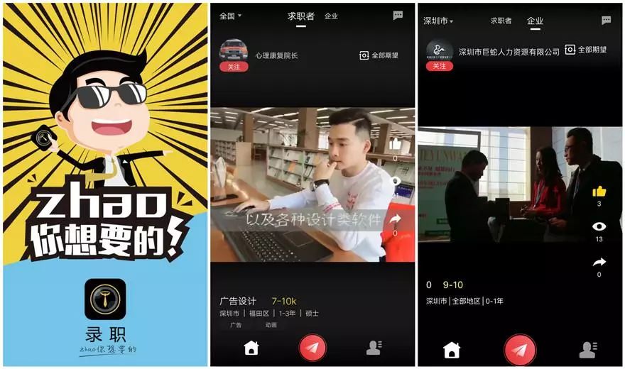 孙东旭解释:“我们把用户定位为85后、90后及95后,这批新青年大多愿意尝试新鲜的求职方式,而且他们已经开始不满足于传统的投递简历方式了,对其来说过于被动。以视频为载体的简历投递,可以让用户在娱乐的同时找到合适的工作。”