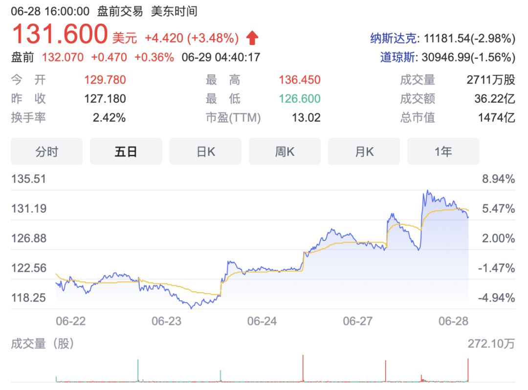 从20%到100%,高通股价拉升,上涨3.48%,而苹果股价下跌2.98%。