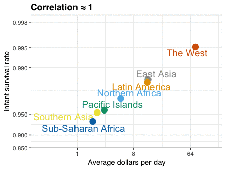 在分享辛普森悖论的动图以后,有些人问我生态谬误是不是相同的情况。其实这二者是不同的。生态谬误是我们试图通过平均值的强相关性来推断个体之间的相关性。为了更好的解释,我用dslabs包中自带的gapminder的数据(http://gapminder.org/)画出了一个动图,展示新生儿存活率的对数与日均收入的对数之间的关系。可以看到在地区层面上二者相关度很高,但在各个国家层面上相关度很低。这是因为同一地区国家与国家之间的差异导致的。