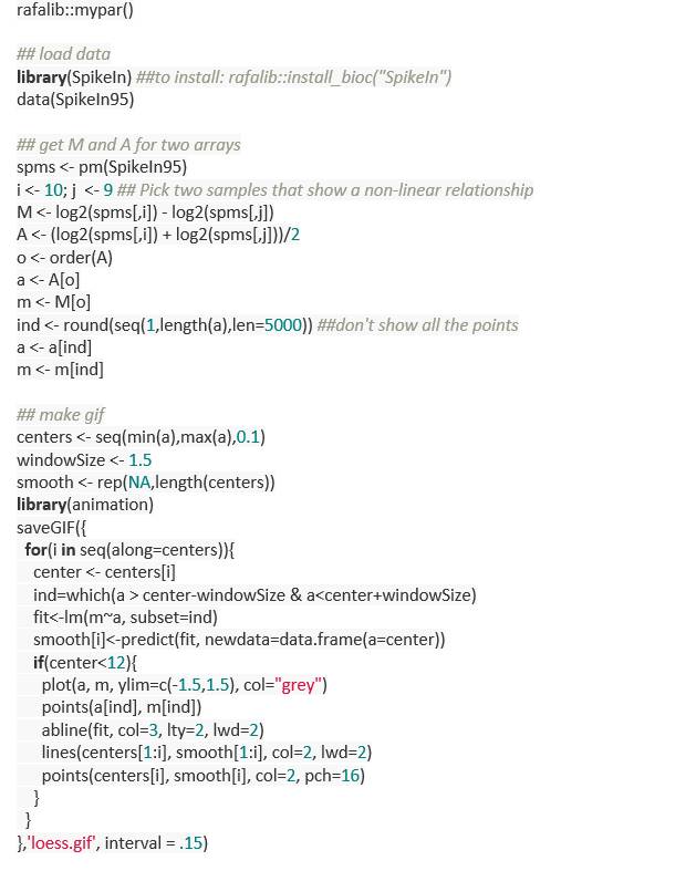 这里的数据来源是某个基因芯片实验。图中所示的是MA图,即比例对数与对数平均值之间的关系。我用animation包来保存gif动图。