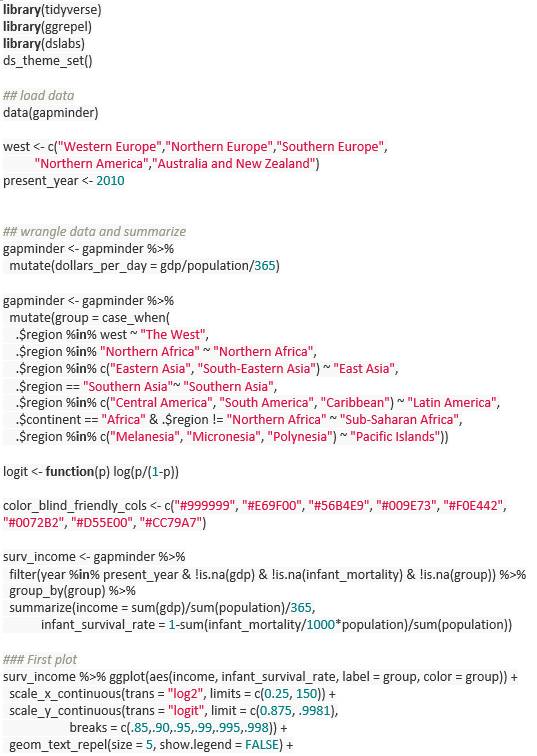 第一张图是地区平均值;撒哈拉以南非洲国家的数值,你可以看到一个平均值被分成数个不同的数值;第三张是所有国家的情况。我标出了一些(与本地区相比)变化较大的国家,并且用了色盲也能识别的颜色。这里的代码有些复杂,原因是我不得不对Gapminder数据进行预处理。