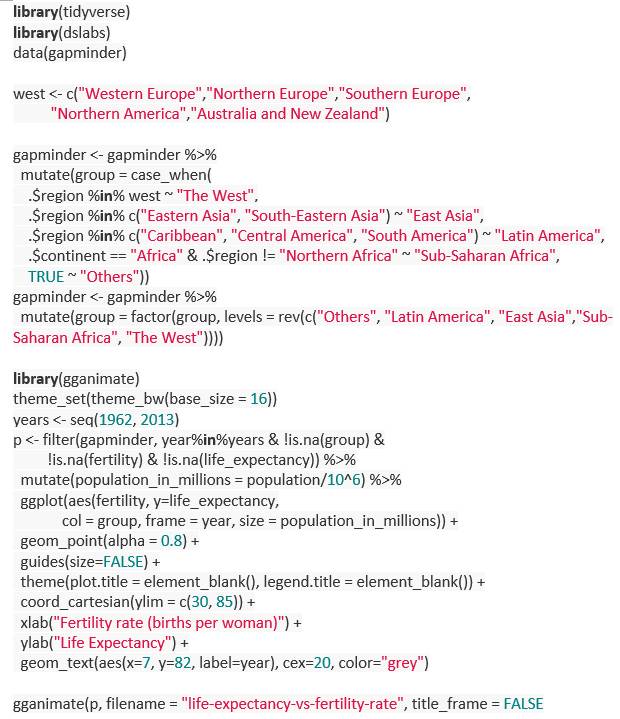 这个gif动图是复制Hans Rosling (https://en.wikipedia.org/wiki/ Hans_Rosling)在他的演讲“关于贫穷的新发现”(New Insights on Poverty,(https://www.ted.com/talks/ hans_rosling_reveals_new_insights_on_poverty?language=en))中展示的动画。该图很好地展现出数据可视化在消除误解方面的作用,Hans Rosling通过这张动图展示了如今并不如40年前一样能够简单将世界划分成两半。之前,人们一般把世界分为拥有更长寿命、较少家庭人口的西方富有国家和较短寿命、较多家庭人口的发展中国家,而这个图向我们展示了这种划分的不合理性。