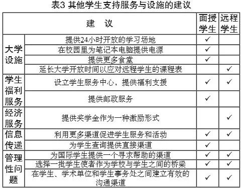 远程学生更多关注知识和社交方面的支持。他们强调了在学校里有学术咨询支持、购买参考书和必读物的需求。他们也提及远程学生是十分孤独的,大部分时间都是独自一个人学习,很少有机会与同学交流,因而建议学校扩展学生组织、学习群组和社交活动,为他们建立一个社交网络,提升对学校的归属感。尽管他们认同远程学生对校园服务和设施的使用不会像面授学生那样频繁,但是他们表达了自己的希望,即延长服务和设施的开放时间,因为他们中大部分人工作日白天都在上班。