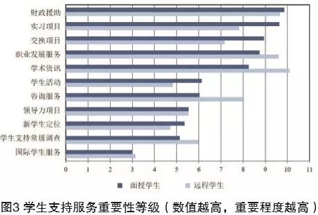 图3显示了支持服务的重要性等级。面授学生认为财务援助是最重要的,他们对实习项目、交换项目和学生活动三项服务重要性排序高于远程学生。与面授学生相比,远程学生认为职业发展、学术提升方面的咨询和服务更重要。值得注意的是,远程学生将学术咨询服务重要性排在了首要位置。