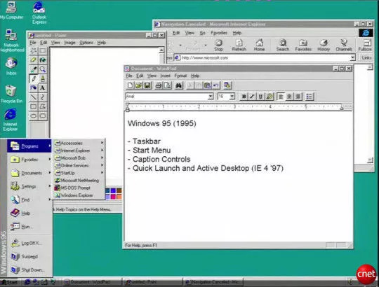1995 年,经典的 Windows 95 发布了。第一次引进了“开始”菜单和桌面任务条,还支持 FAT32 文件系统。