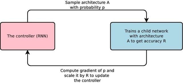 在 AutoML 架构中,有一个名为“the controller(控制器)”的 RNN(循环神经网络),它可以设计出一种被称为“child”的模型架构(子模型),而这个“子模型”在训练后可以通过特定任务来进行质量评估。随后,反馈的结果返回到控制器中,以此来帮助提升下一次循环中的训练设定。如下图所示: