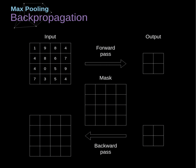 在实际操作中,该过程是通过创建一个掩膜(mask)来实现的,该掩膜会记住在前向传播中所使用的元素的位置,随后我们就可以用该掩膜来传递梯度。