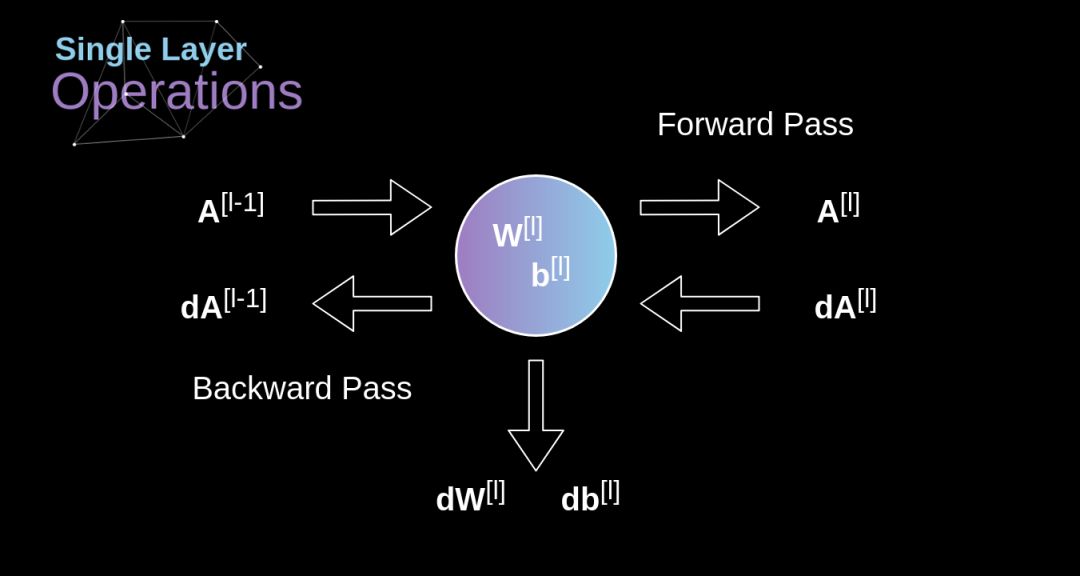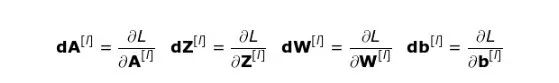 我们的任务是计算 dW [1] 和 db [l] (它们是与当前层参数相关的导数),以及 dA[l-1](它将被传递给前一层)。