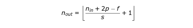 输出张量的尺寸(可以称为3D矩阵)满足以下等式,其中:n - 图像大小,f - 滤波器大小,nc - 图像中的通道数,p - 填充大小,s - 步幅大小,nf - kernel 的数量。
