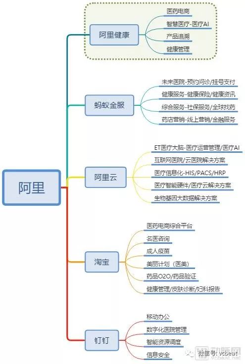 谈阿里健康的发展必然会带出整个阿里系在医疗健康领域的布局。动脉网梳理发现,阿里系几乎所有的大型公司都有医疗相关的业务,比如蚂蚁金服的未来医院、健康服务、金融服务、保险服务,阿里云的医疗信息化、云解决方案、生物基因大数据解决方案,淘宝的成人疫苗、美丽计划,钉钉的数字化医院等。