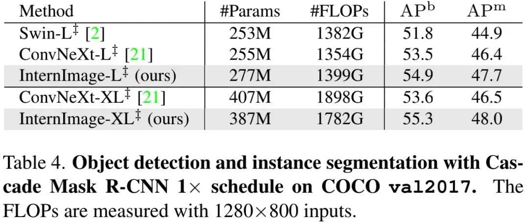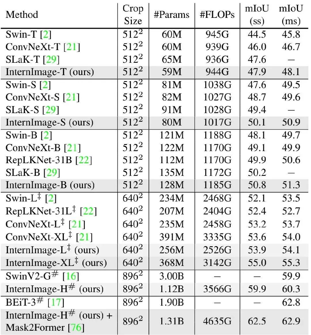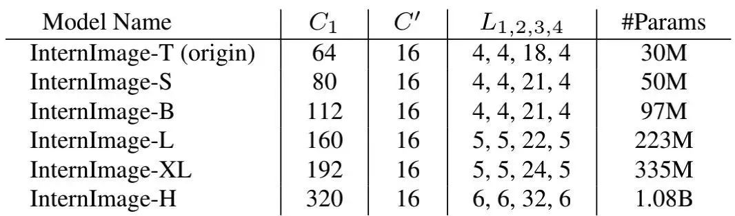 其中, 。通过实验, 作者发现最佳缩放配置为详见下表。为进一步探索模型容量, 作者还构建了具有 参数量的InternImage-H.