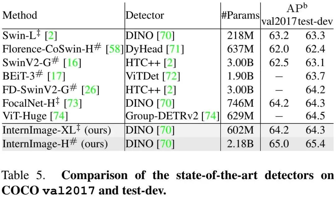 不同于近来聚焦于大核的CNN方案,InternImage以形变卷积作为核心操作(不仅具有下游任务所需的有效感受野,同时具有输入与任务自适应空域聚合能力)。所提方案降低了传统CNN的严格归纳偏置,同时可以学习更强更鲁棒的表达能力。ImageNet、COCO以及ADE20K等任务上的实验验证了所提方案的有效性,值得一提的是:InternImage-H在COCO test-dev上取得了新的记录65.4mAP。
