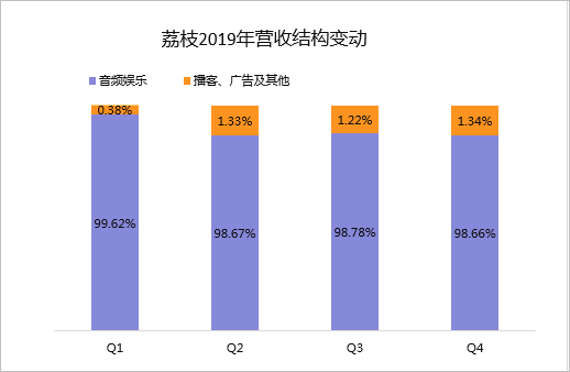 从财报营收组成上看,荔枝的收入模式依然较为单一,荔枝高达98%的营收来自于平台用户打赏主播所获得的收入。