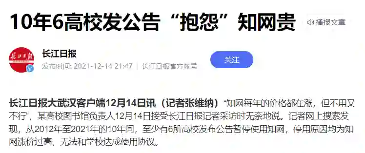 事实上,知网的“贵”已经不是一天半天的事,2021年底,长江日报曾发新闻称, 10年间已有6所高校“抱怨”知网太贵,