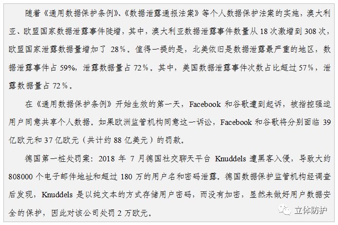 2016年4月,欧洲议会投票通过了《通用数据保护条例》(General Data Protection Regulation ,简称GDPR),并于2018年5月25日开始实施。GDPR的通过意味着欧盟对个人信息保护及其监管达到了前所未有的高度,可称得上史上最严格的数据保护条例。根据GDPR,没有保护好数据导致数据泄露行为,行为轻微的要罚款1000万欧元或全年营收的2%(两者取最高值),行为严重的则要罚款2000万欧元或全年营收的4%(两者取最高值)。