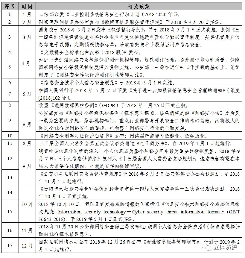 大数据、工业互联网、智慧城市的安全和个人信息保护是2018年各项政策法规的关注点。随着《网络安全法》的实施,许多监管规定、行业与技术标准开始落地,国内的信息安全工作越来越有法可依,有据可查。