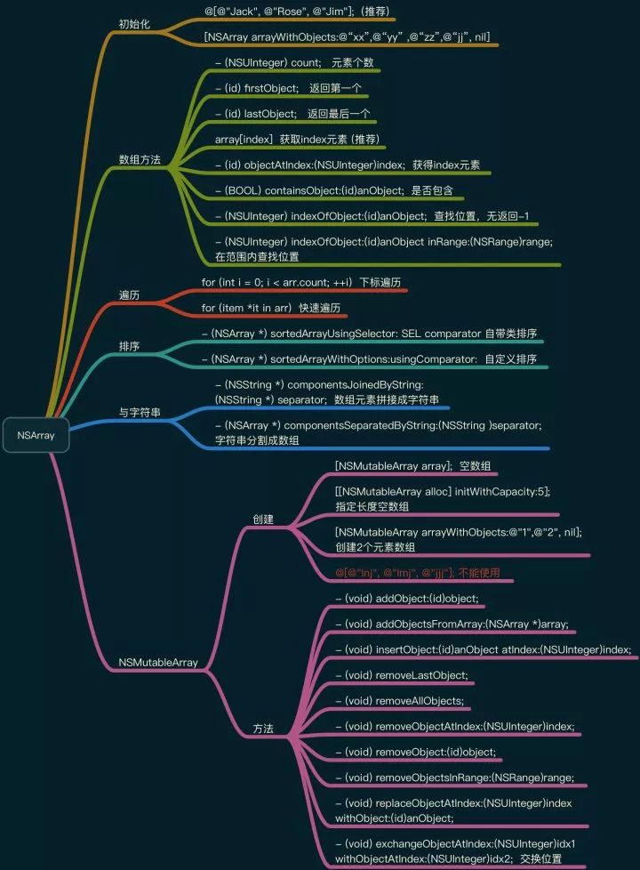 很多数组的操作方法和在 JS 中对比大致相同,不过 NSMutableArray 提供了比 JS 中一些更丰富的方法,包括交互两个元素位置这种需要自己写的方法,也即很多时候编写时候可以先查查文档看是否有这个方法, 很多时候可以从里面找到。