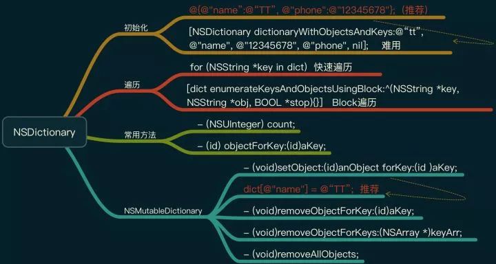 NSDictionary 属于不可变字典类,一般创建之后只能用于查询,不能对其进行修改操作,想修改需要使用 NSMutableDictionary 类。